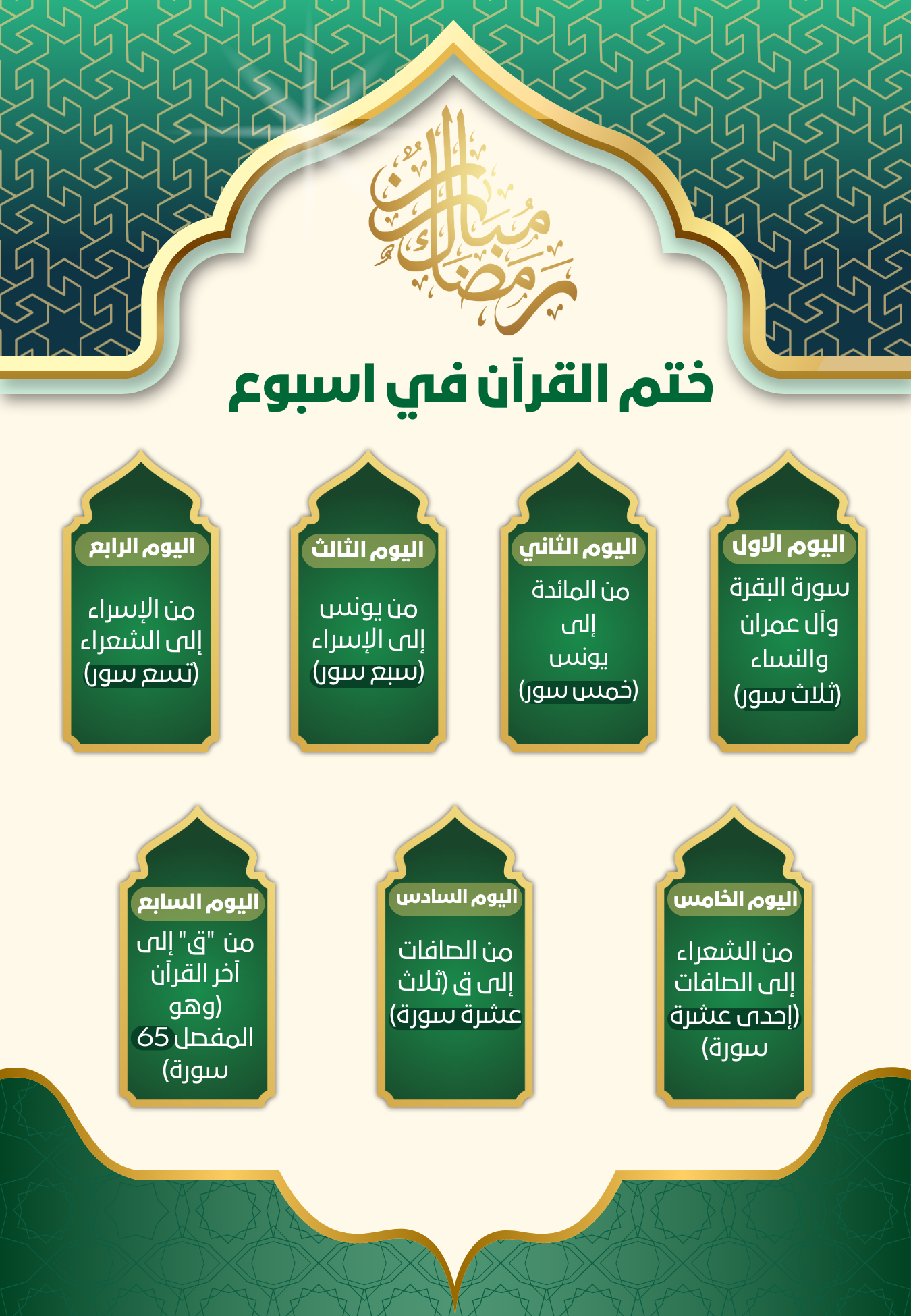 تقسيم واضح ومريح لأجزاء القرآن على مدار الأسبوع، ليكون الختم قريبًا منك… خطوة بخطوة.